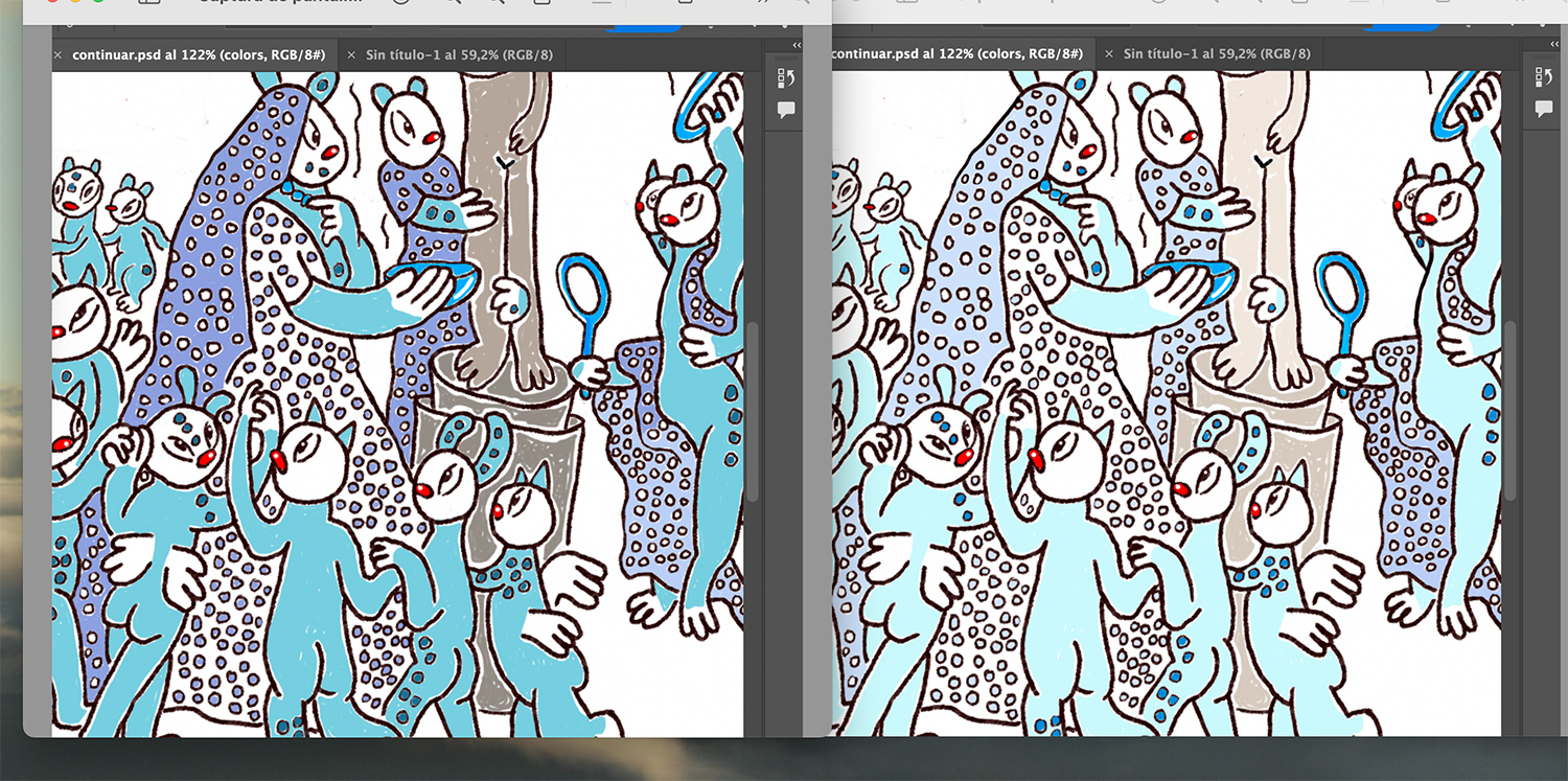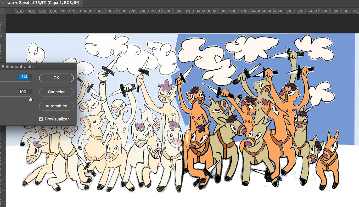 El dibujo que veis en la portada es, con diferencia, el que me ha llevado más horas; todas suman unos seis meses con parones. No por una dificultad extrema, sino por rumiar demasiado las partes viscerales como el movimiento y el color, y no rallarme ni tres en los aspectos preventivos como el sangrado y las dimensiones de la escena… Aparte, los peligrosos parones creativos, dañinos si se dilatan en el tiempo y mortales si no hay suficiente foco. Muchos cambios y muchas dudas… ¿Sobrecarga sensorial otra vez?